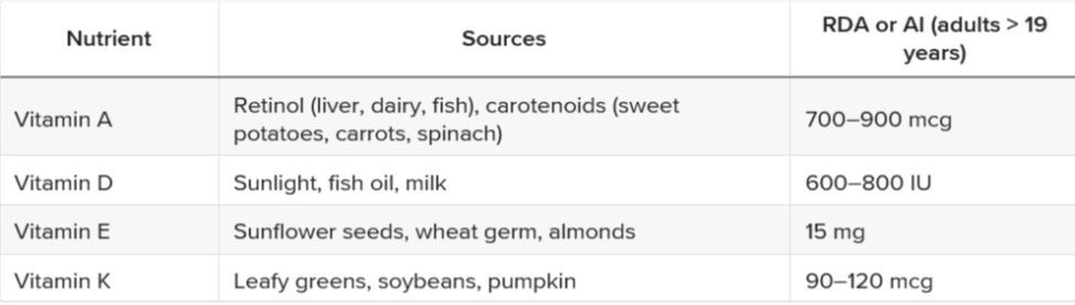 - Sources and recommended intakes of fat-soluble vitamins are,