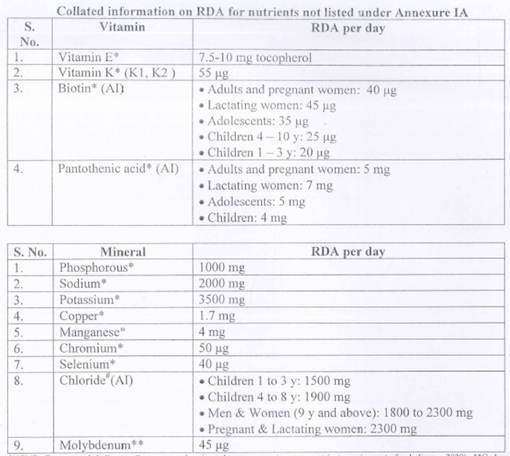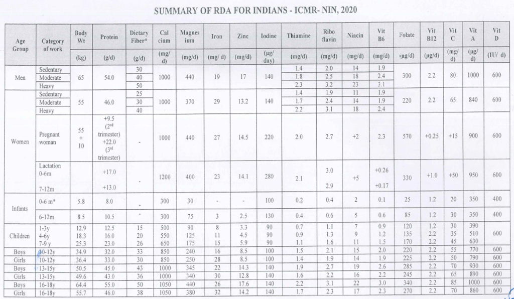 - In India, the Indian Council of Medical Research (ICMR) and the National Institute of Nutrition (NIN) define the Recommended Dietary Allowances (RDA). The most recent comprehensive standards, RDA 2020, replaced the decade-old 2010 guidelines and are currently mandated by the FSSAI for food businesses.
