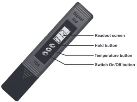 - Remove the cap from the TDS meter. Switch on the TDS meter using the “On/Off” button.