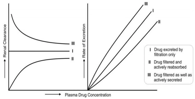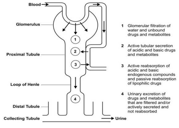 | Renal excretion | Glomerular filtration, active secretion, active/passive reabsorption | Free, hydrophilic, unchanged drugs/metabolites/conjugates with Molecular Weight (MW) < 500. |