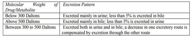 - The most important factor governing the excretion of drugs in bile is their molecular weight. Its influence on biliary excretion is summarized in the below Table.