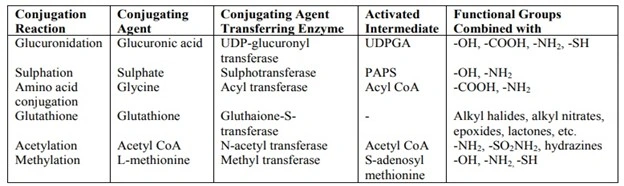 - These reactions generally involve covalent attachment of small polar endogenous molecules such as glucuronic acid, sulphate, glycine, etc. to either unchanged drugs or phase I products having suitable functional groups viz. -OH, -COOH, -NH2 and -SH and form highly water-soluble conjugates which are readily excretable by the kidneys (or bile). Thus, these reactions are called as conjugation reactions.