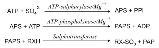 - Synthesis of an activated coenzyme 3′-phosphoadenosine-5′-phosphosulphate (PAPS)which acts as a donor of sulphate to the substrate.